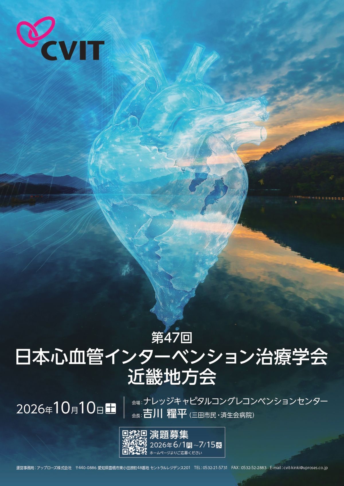 会 期 2026年10月10日(土) 会 場 ナレッジキャピタル コングレコンベンションセンター 会 長 吉川 糧平(三田市民・済生会病院) お問い合わせ先 第47回日本心血管インターベンション治療学会 近畿地方会運営事務局 〒440-0886 豊橋市東小田原町48番地 セントラルレジデンス201 TEL:0532-21-5731 FAX:0532-52-2883 E-mail: cvit-kinki@uproses.co.jp